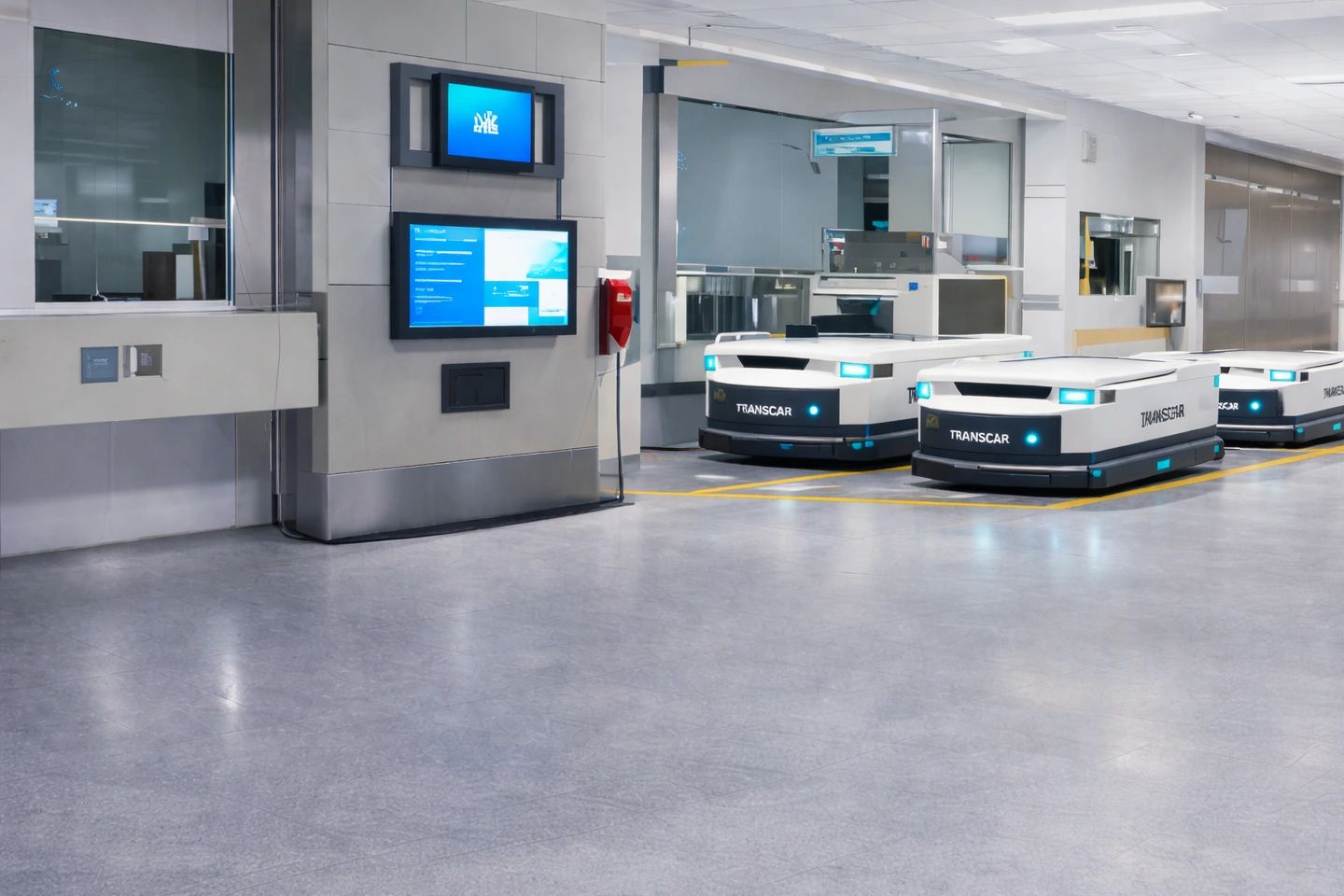 A hospital AGV system uses Automated Guided Vehicles to transport carts and supplies efficiently across departments.